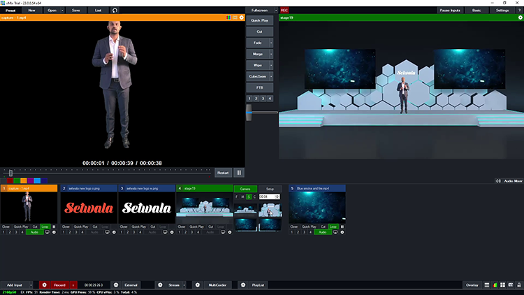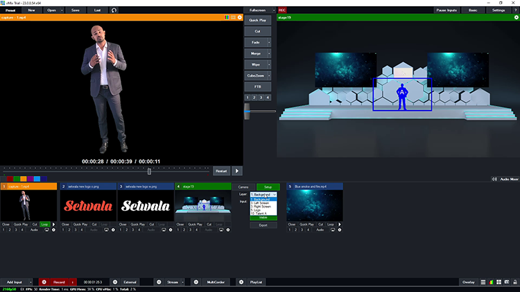 A 4K vMix virtual production stage designed with a dual-screen layout offers a versatile and professional environment for modern live events. The two large screens are optimized for live video feeds, presentations, Zoom call integrations, and animated video content, making the setup ideal for hybrid conferences, webinars, and virtual productions. The design ensures smooth content switching and high-quality 4K output for a polished broadcast experience.