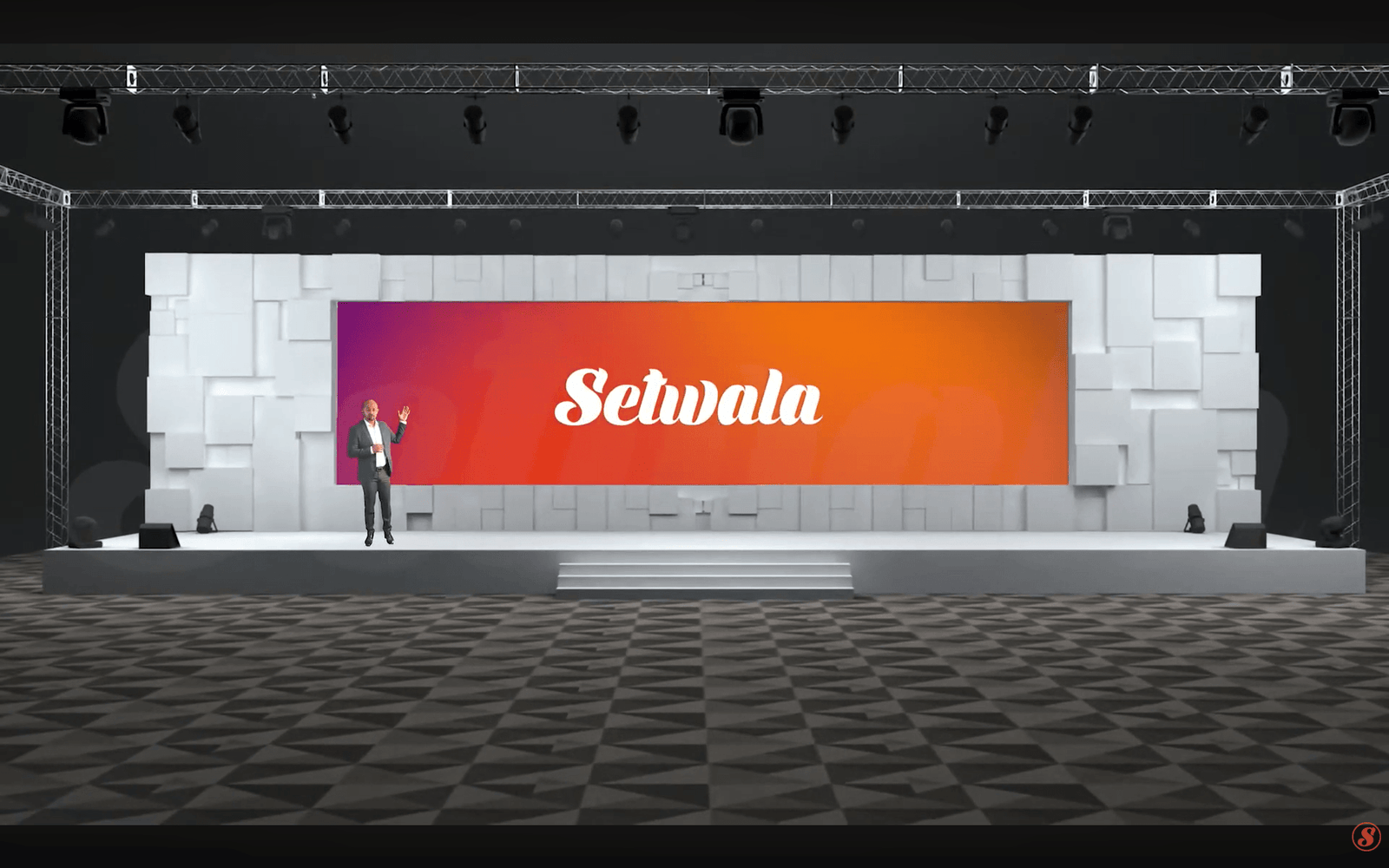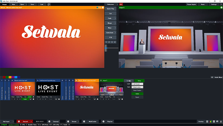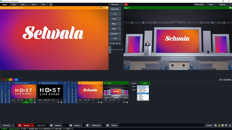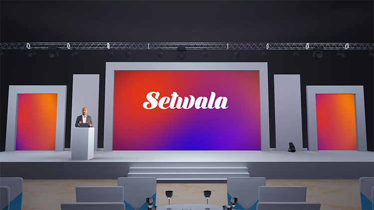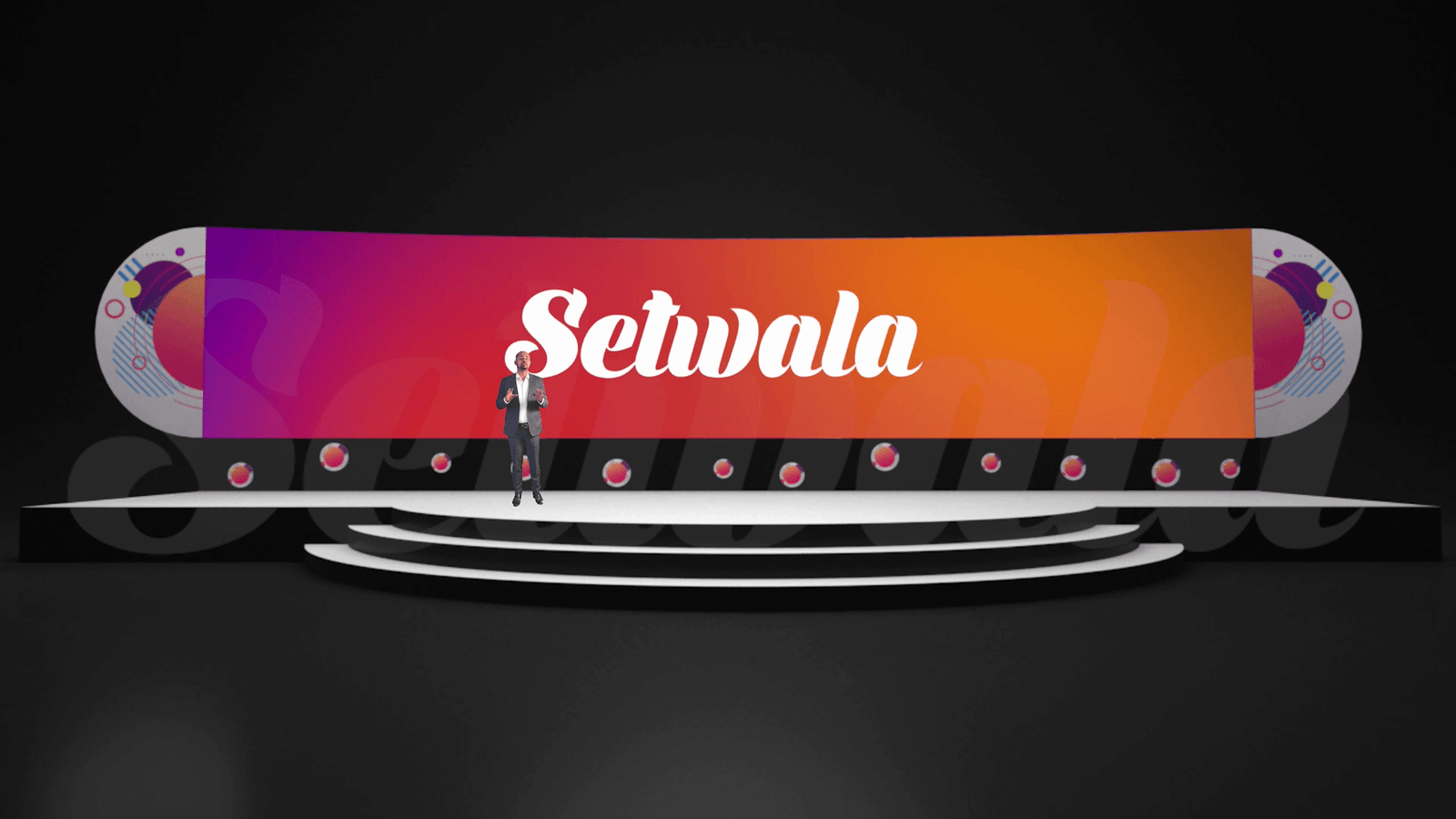 A modern three-screen virtual stage design for vMix 4K is built to deliver a highly flexible and broadcast-ready environment for virtual events, conferences, and hybrid productions. The setup features a central main screen for primary content delivery, supported by two side panels that can be dynamically branded with logos, sponsor visuals, or event identity graphics. These side panels are fully customizable and allow easy real-time switching of screen graphics, making the entire stage adaptable for different sessions within the same event. The design ensures a clean, professional, and immersive visual composition that enhances presenter focus while maintaining strong brand visibility.