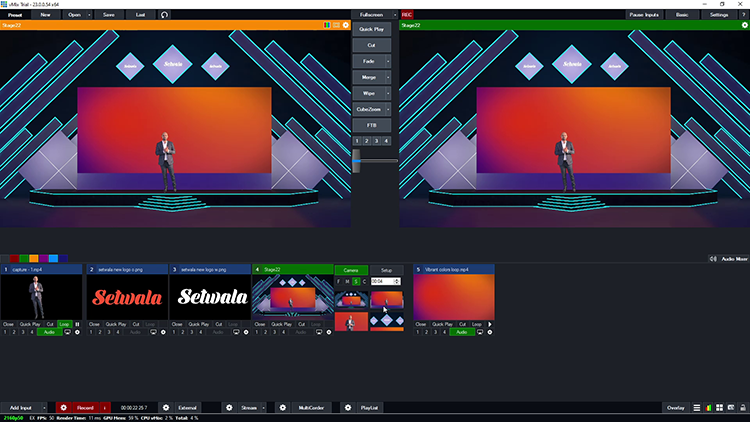 The virtual set is built for flexibility, allowing you to easily change screen graphics to suit different event themes or content requirements. It also includes an option to update logos at the top of the stage, making branding quick and seamless. Whether you’re hosting a formal conference or a celebratory awards event, the adaptable design ensures the stage always looks polished and professional.